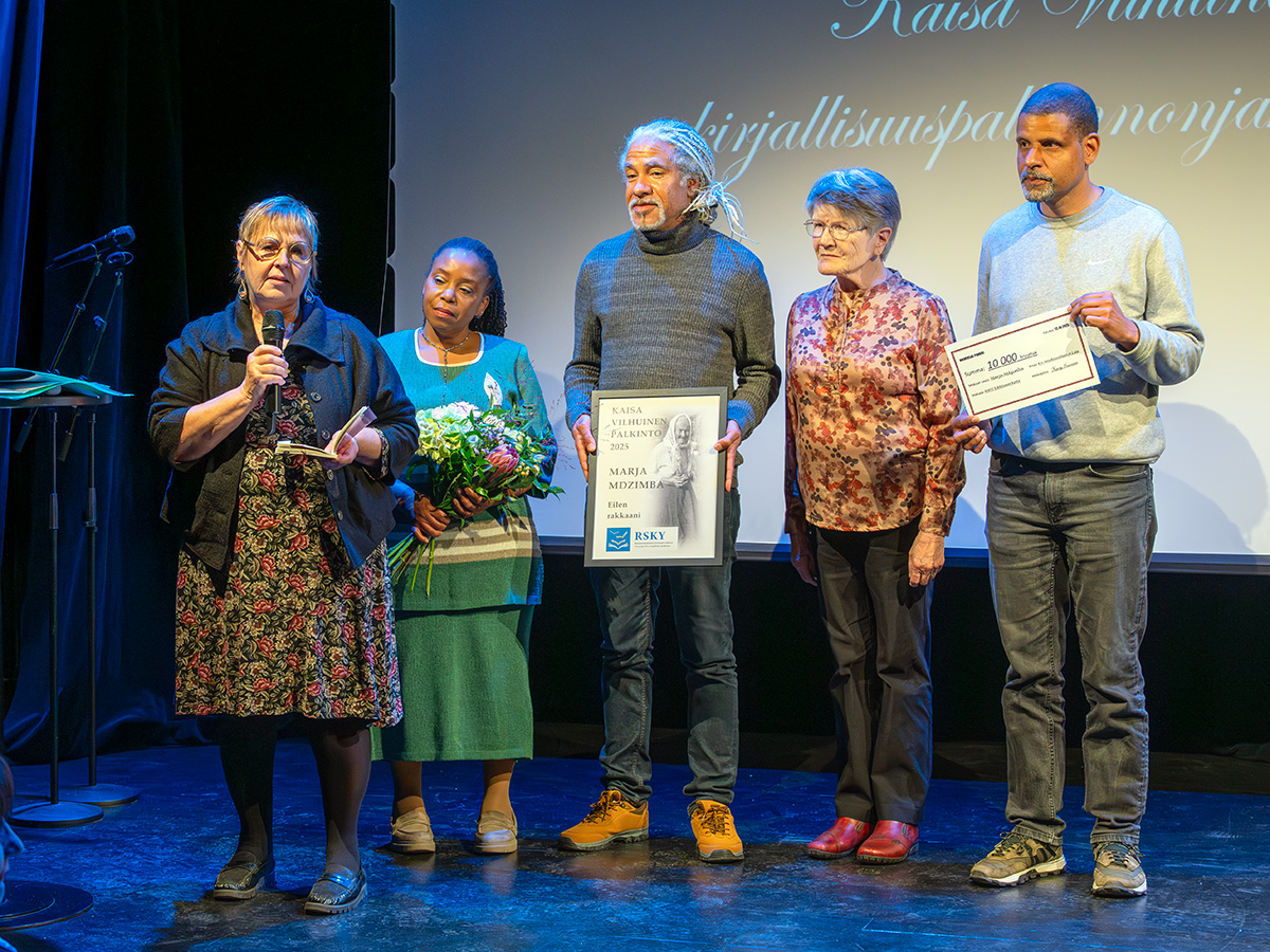 kirjailija Maarit Turtiainen lausui Marjan Eilen rakkaani -kirjan runoja. Näyttämöllä myös palkinnon vastaanottajat Gynthia Mdzimba, Edward Mdzimba, Arja hyytiä ja Robert Mdzimba. |